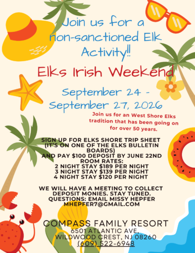 For more than fifty years, West Shore Elks members have proudly upheld the tradition of attending Irish Weekend in Wildwood Crest, New Jersey. We have stayed at the Family Compass Hotel, conveniently located just one block from the beach and a short drive from Irish Weekend festivities, the boardwalk, the car show, and so much more.